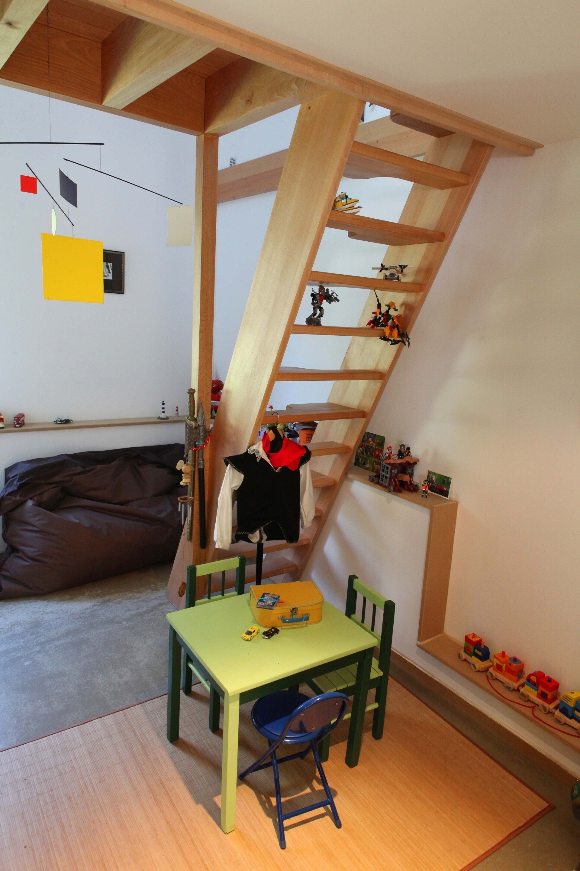 au sol (quatre enfants) pour un maximum d'espace. Nous avons profité de la mono-pente pour créer des mezzanines