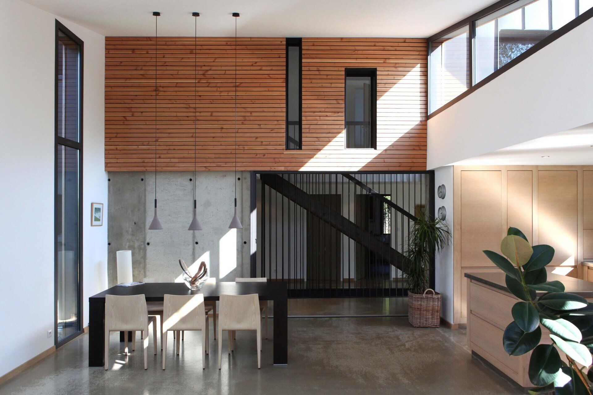 en fonction de l'heure de la journée : l'espace nuit orientée à l'Est pour la lumière du matin et l'espace jour pour la lumière « à l'heure de l'apéro ». Ces espaces sont également distingués par leur aspect extérieur (bardage bois et zinc anthracite). La cuisine, en débord, marque l'entrée et prolonge la circulation intérieure centrale qui dessert les chambres en enfilade.