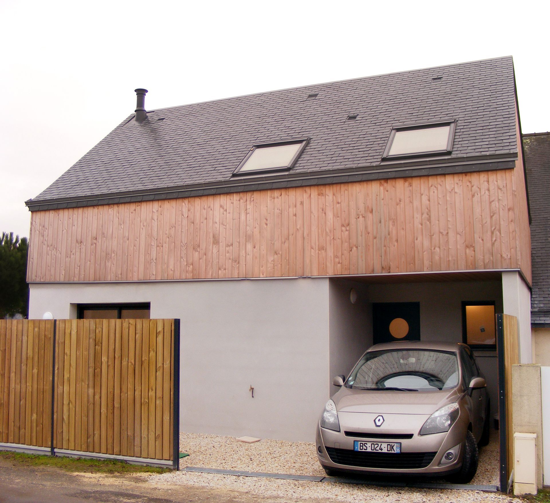 La partie supérieure est bardée de bois pour casser ces façades minérales imposantes. On a ajouté également une partie couverte au Nord pour la voiture et une autre pour la terrasse au Sud avec une grande baie à galandage afin d’agrandir le séjour l’été.