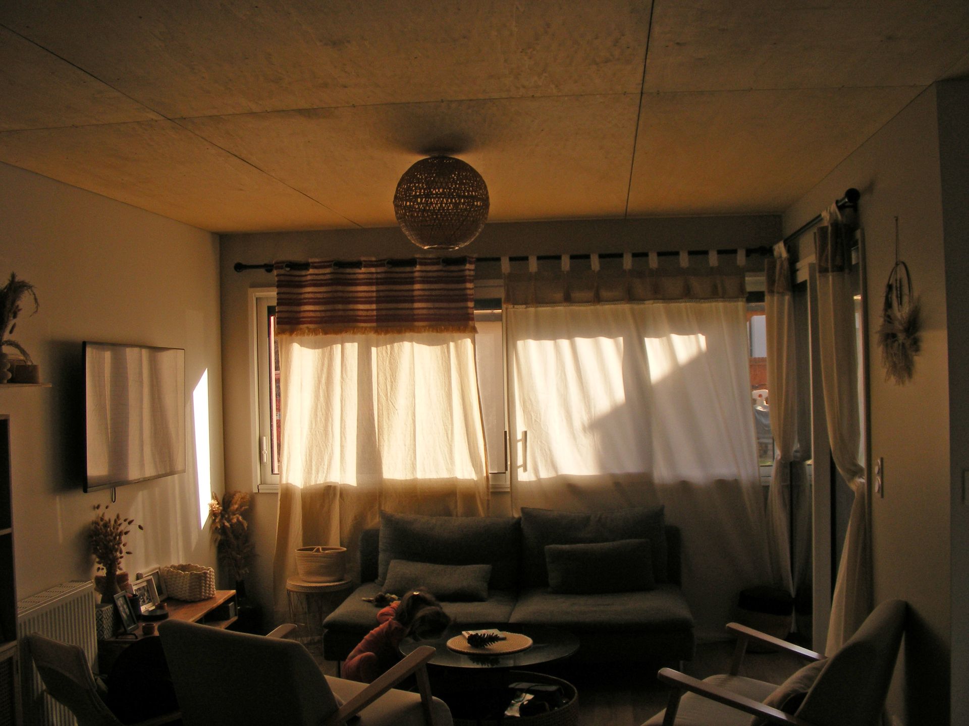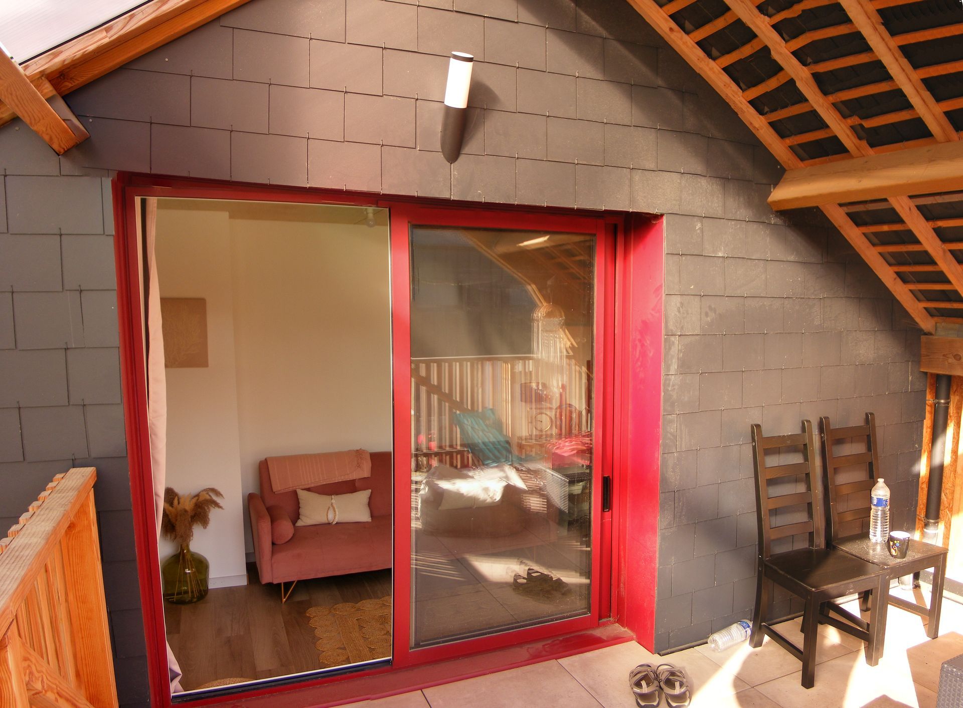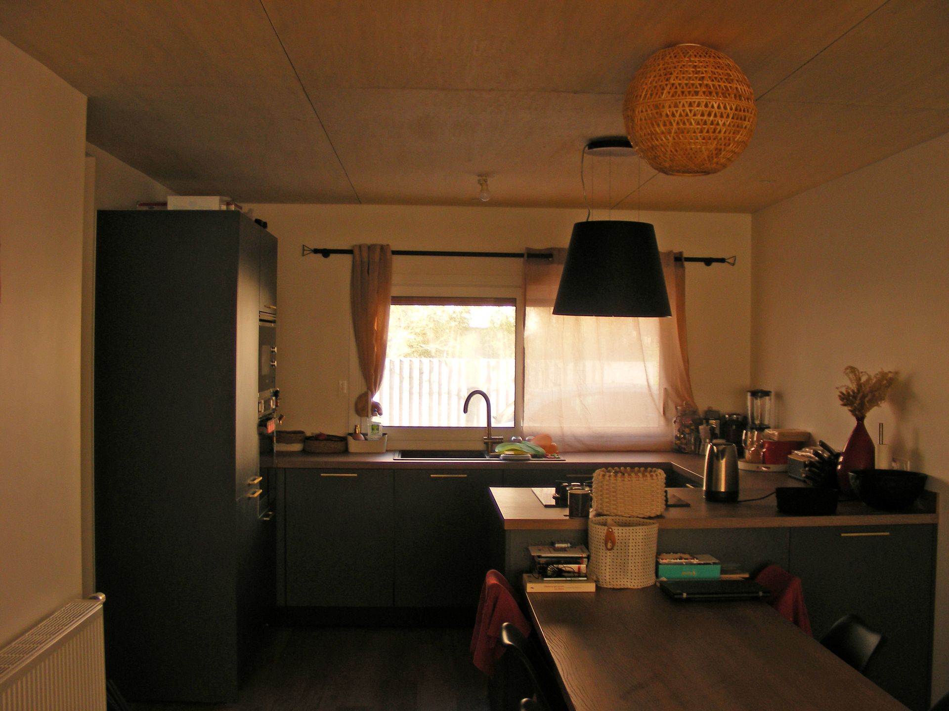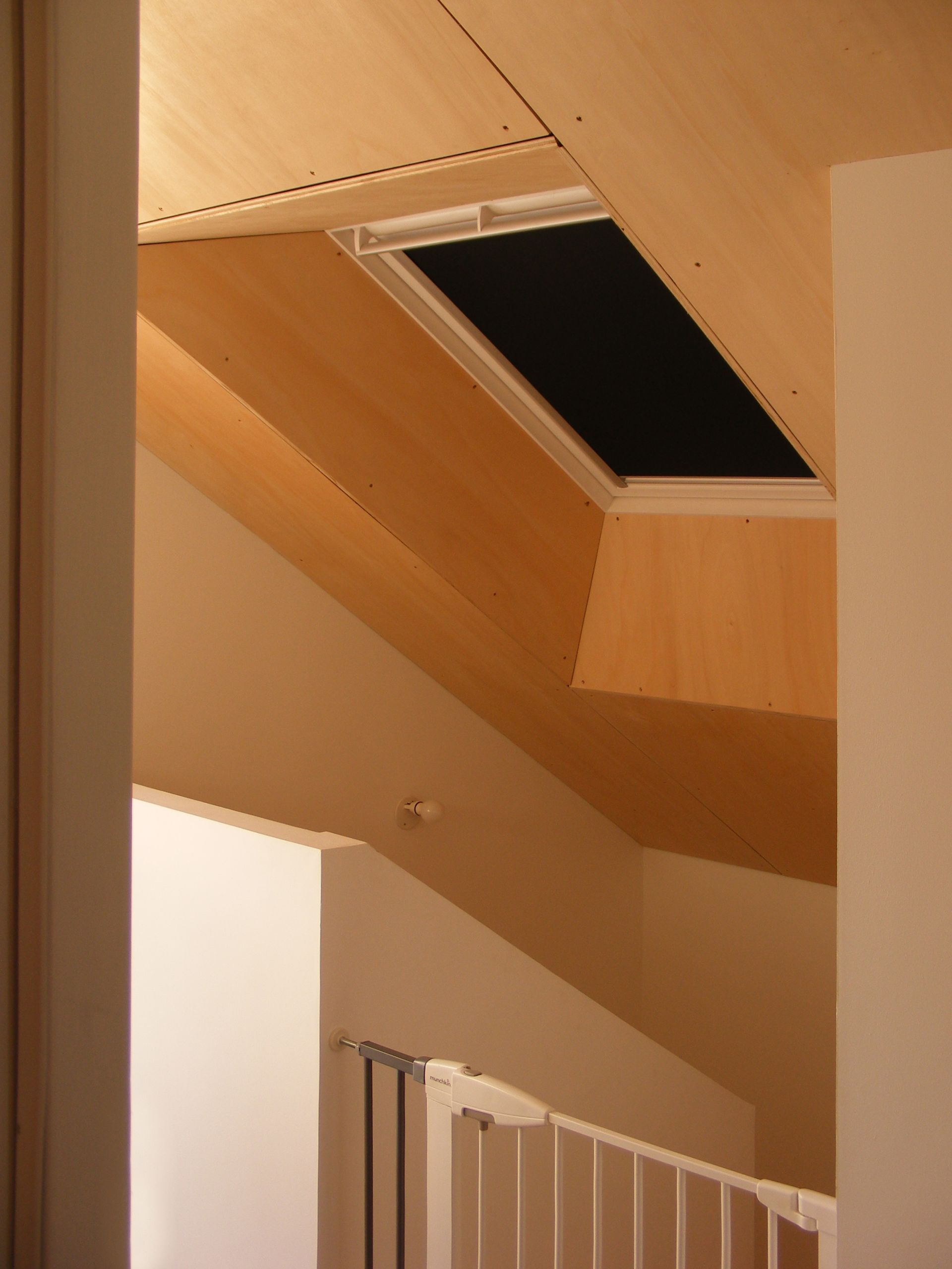 Cette impression de cabane est accentuée par les plafonds en contre-plaqué-bouleau. Comme les clients faisaient la peinture eux-même et que les plafonds c’est épuisant à faire, j’ai proposé du bois et donc de la peinture en moins à faire.