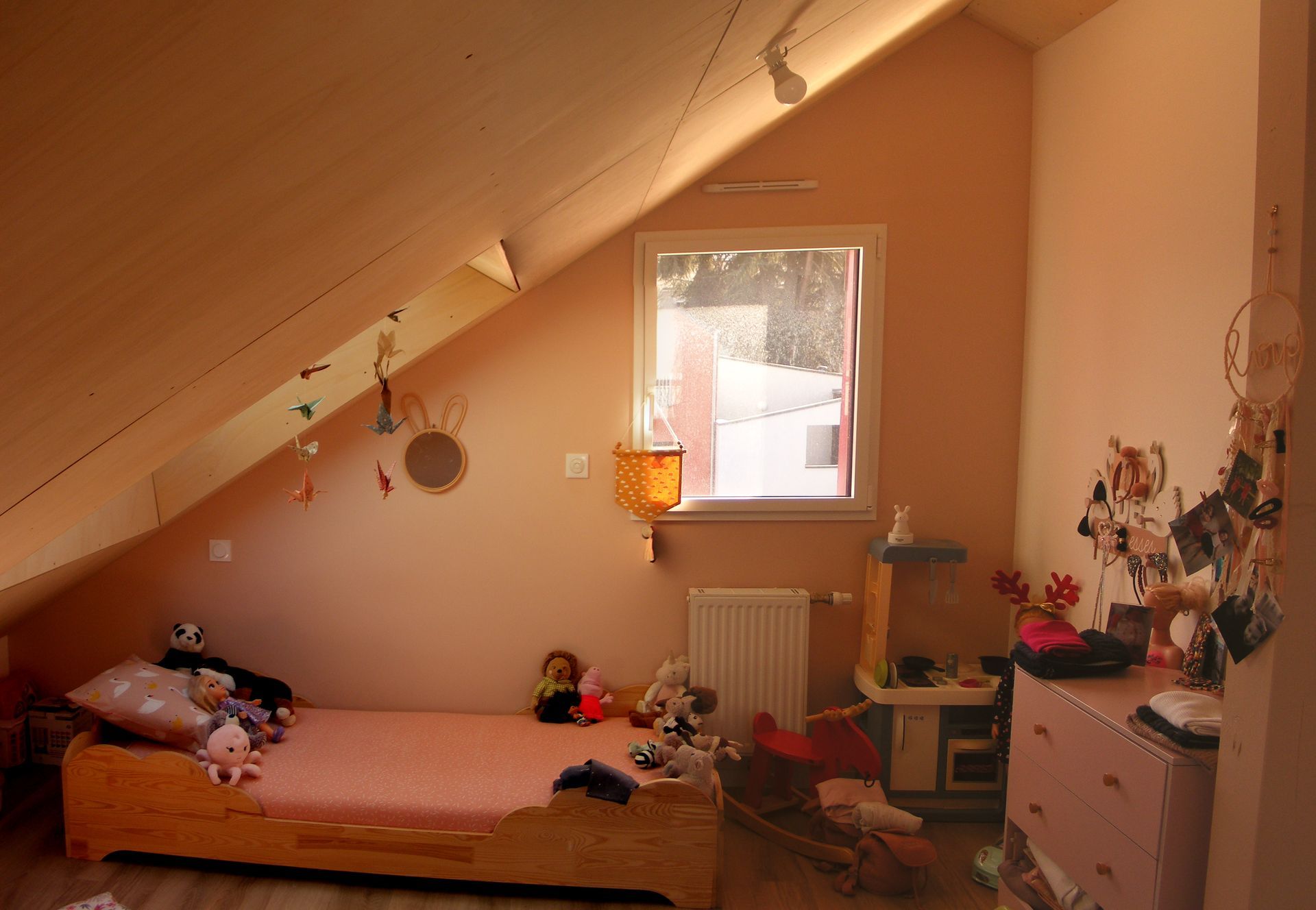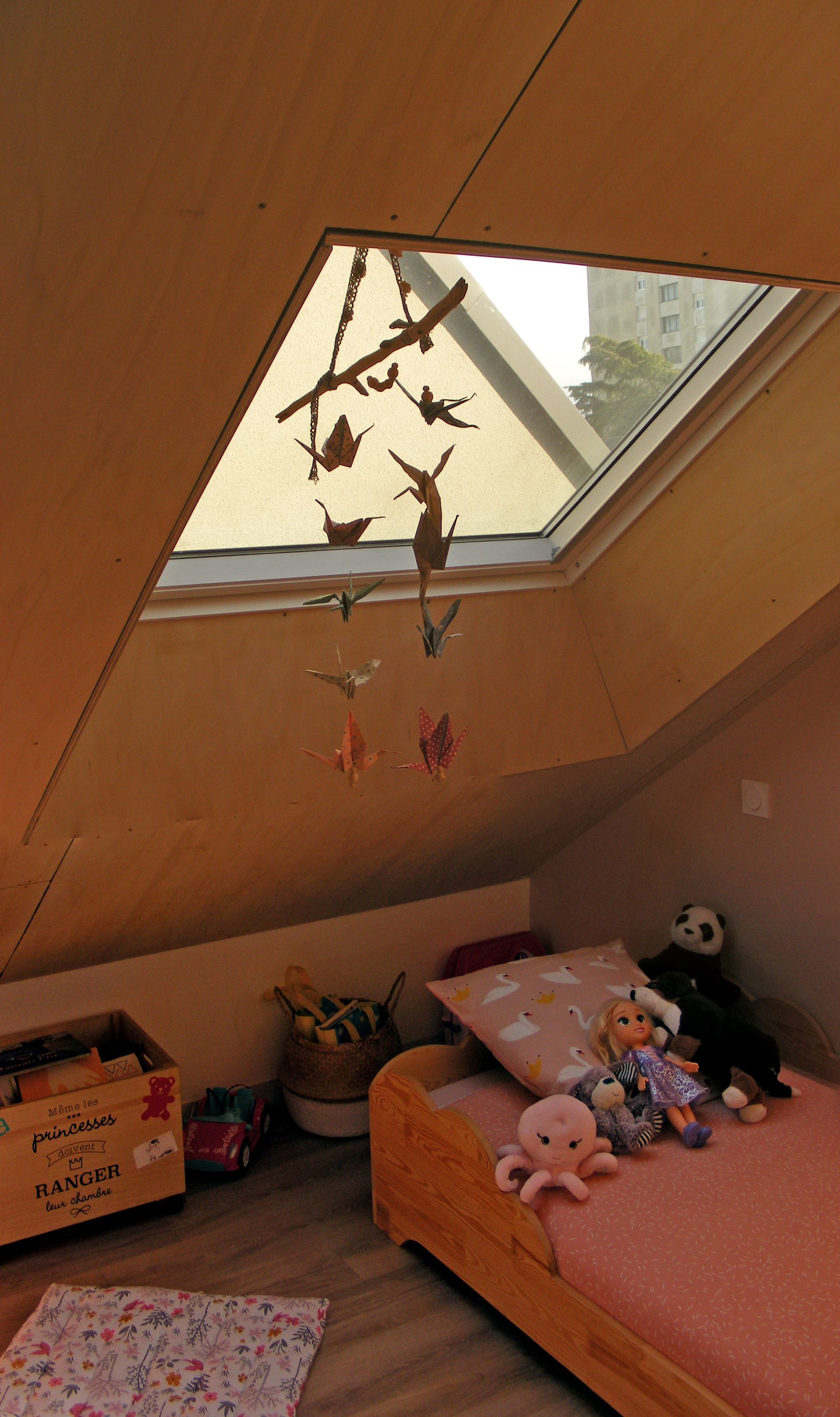 afin de créer des espaces sous combles moins onéreux. On crée de la surface non taxable mais exploitable. Afin d’avoir un peu de hauteur à certain moment, nous avons mis deux grand velux. Les filles ont l’impression de dormir dans une cabane.
